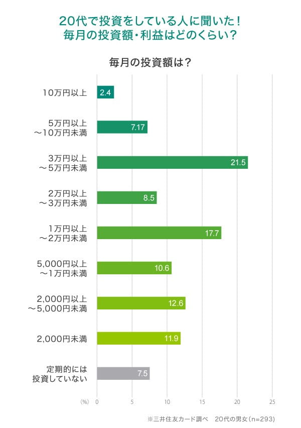 三井住友カードが投資を行っている20代の1000人に実施したアンケート調査によると、毎月の投資額で最も多い価格帯は「3万円以上〜5万円未満」です。
