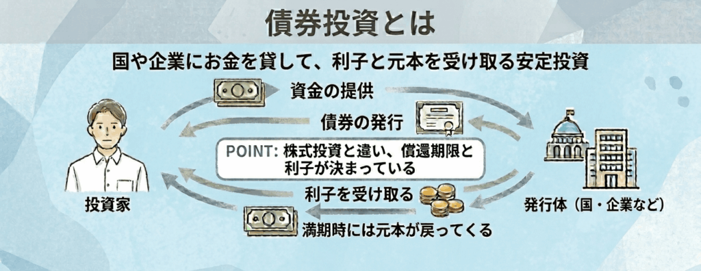 債券は国や企業などが資金調達を行うために発行する借用証書のような有価証券です。債券投資では債券を購入し、利息や元本の返済によって利益を得ます(下図参照)。